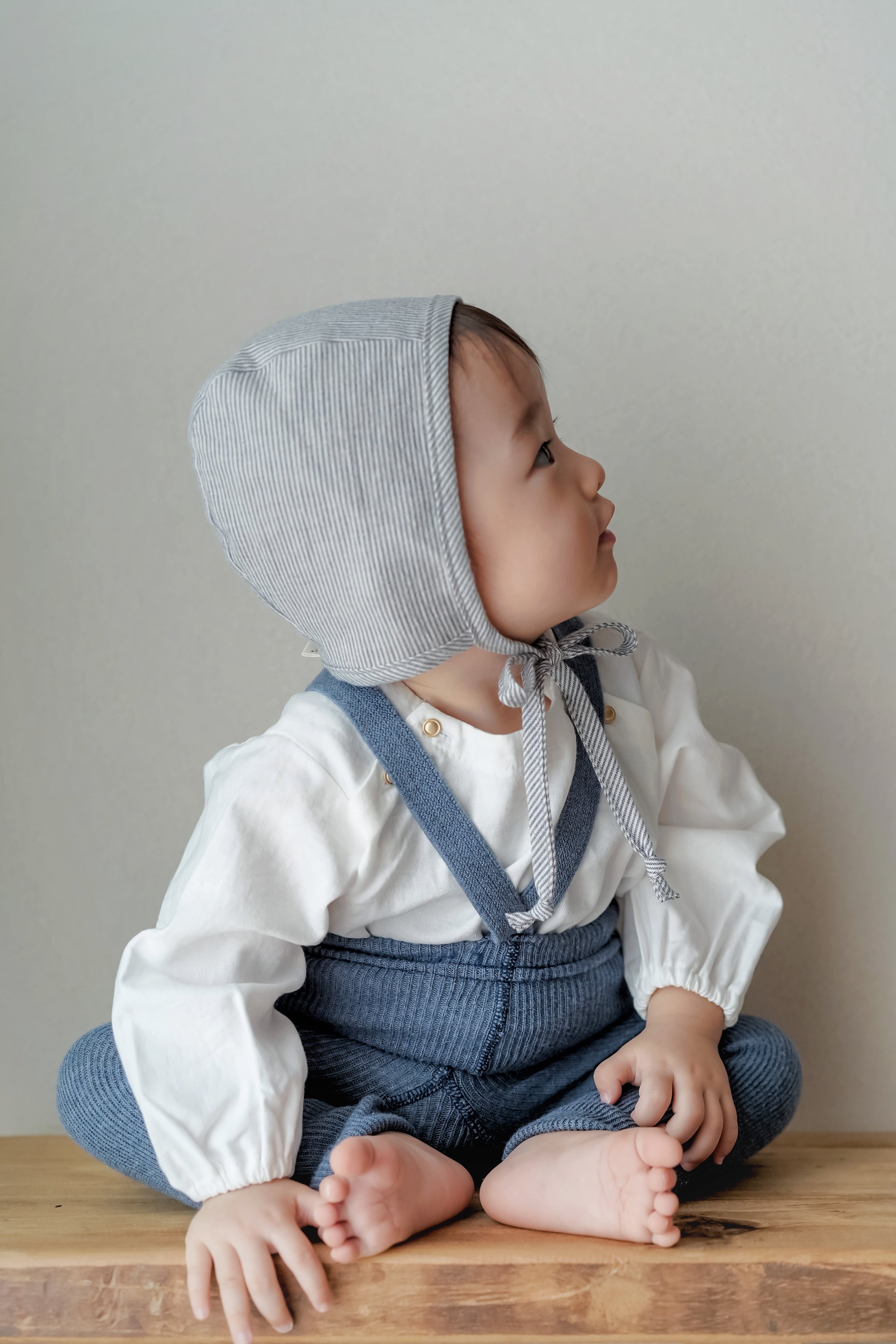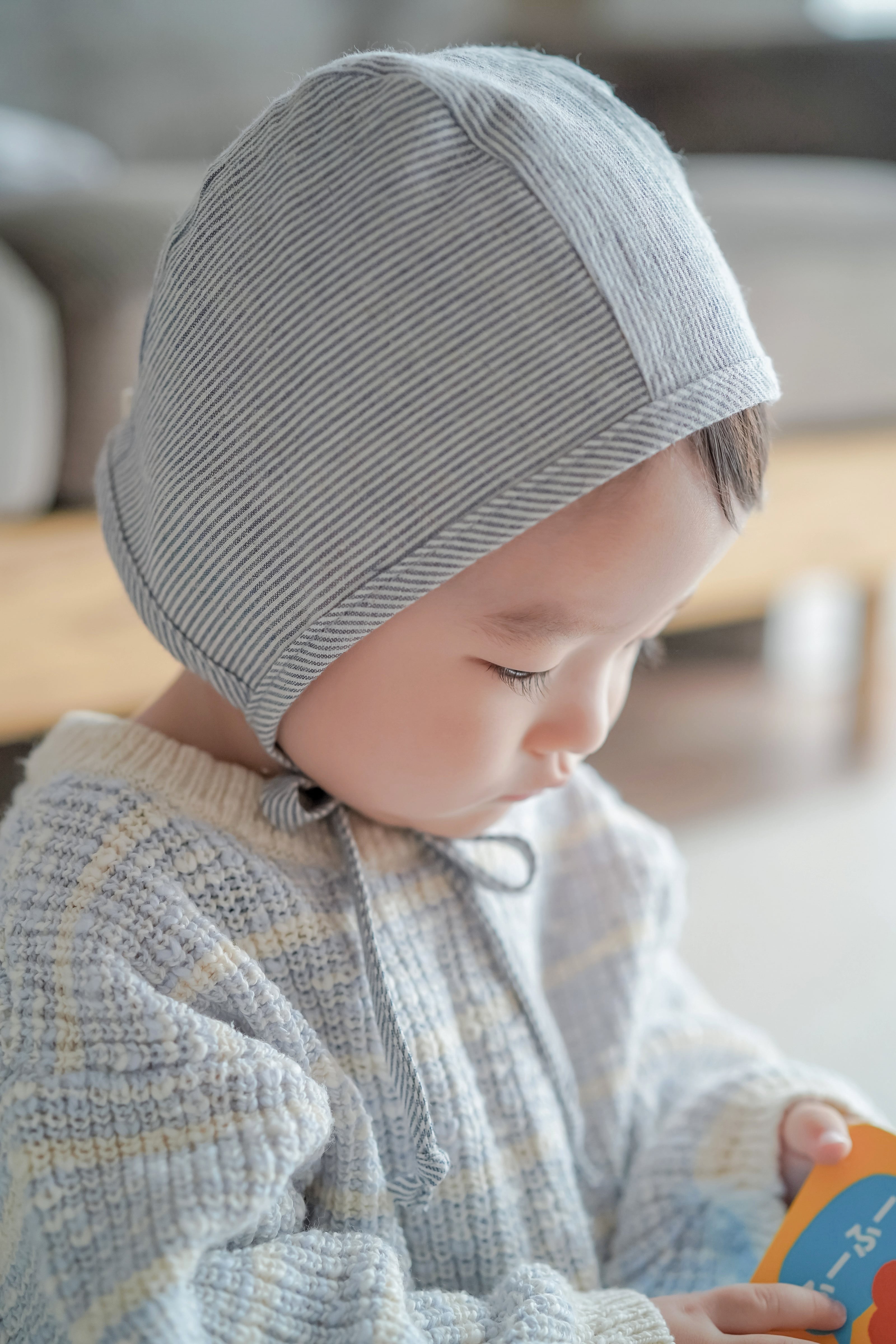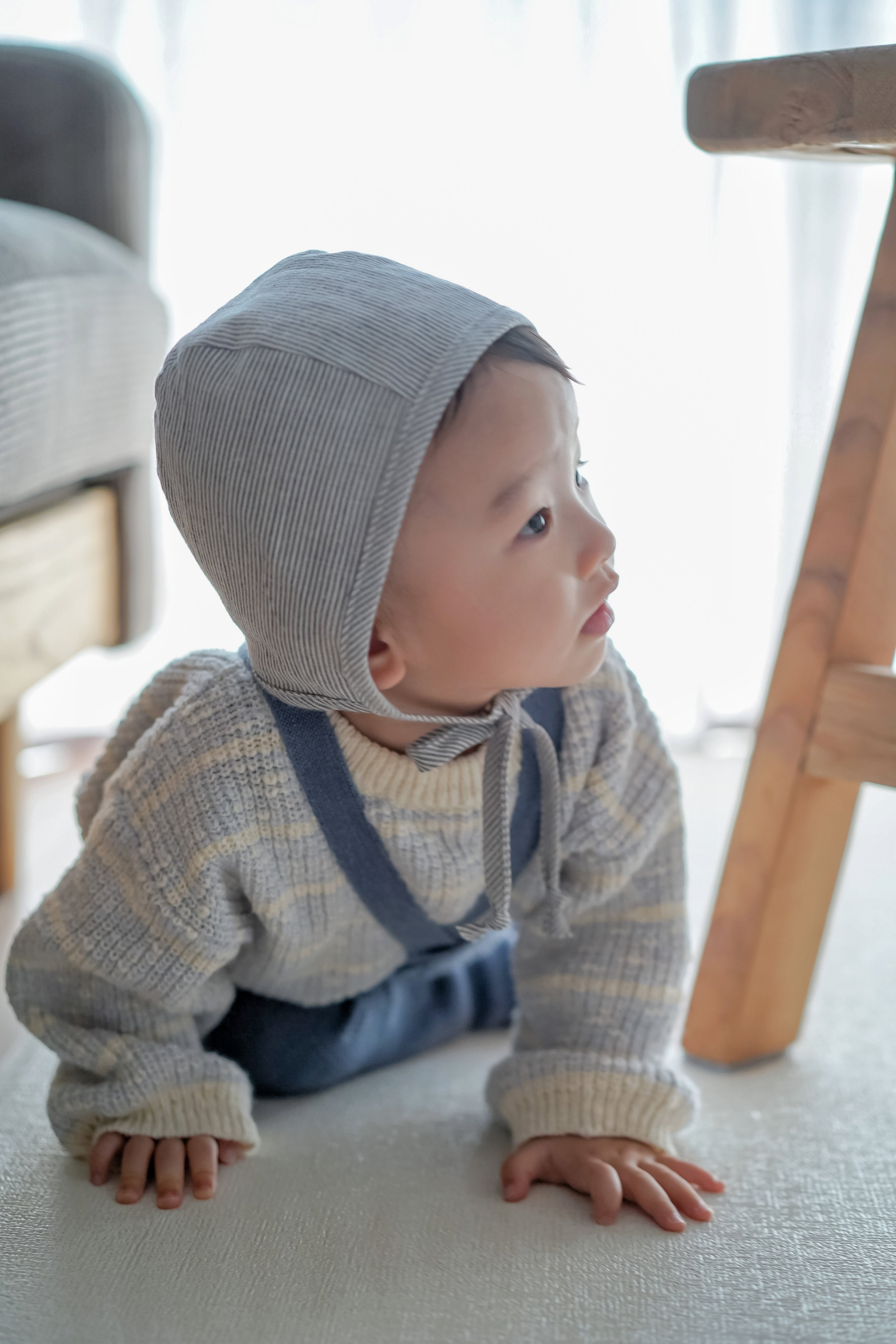 写真6〜11枚目…生後11ヶ月、頭囲43cm、Sサイズ(ネイビーストライプ)