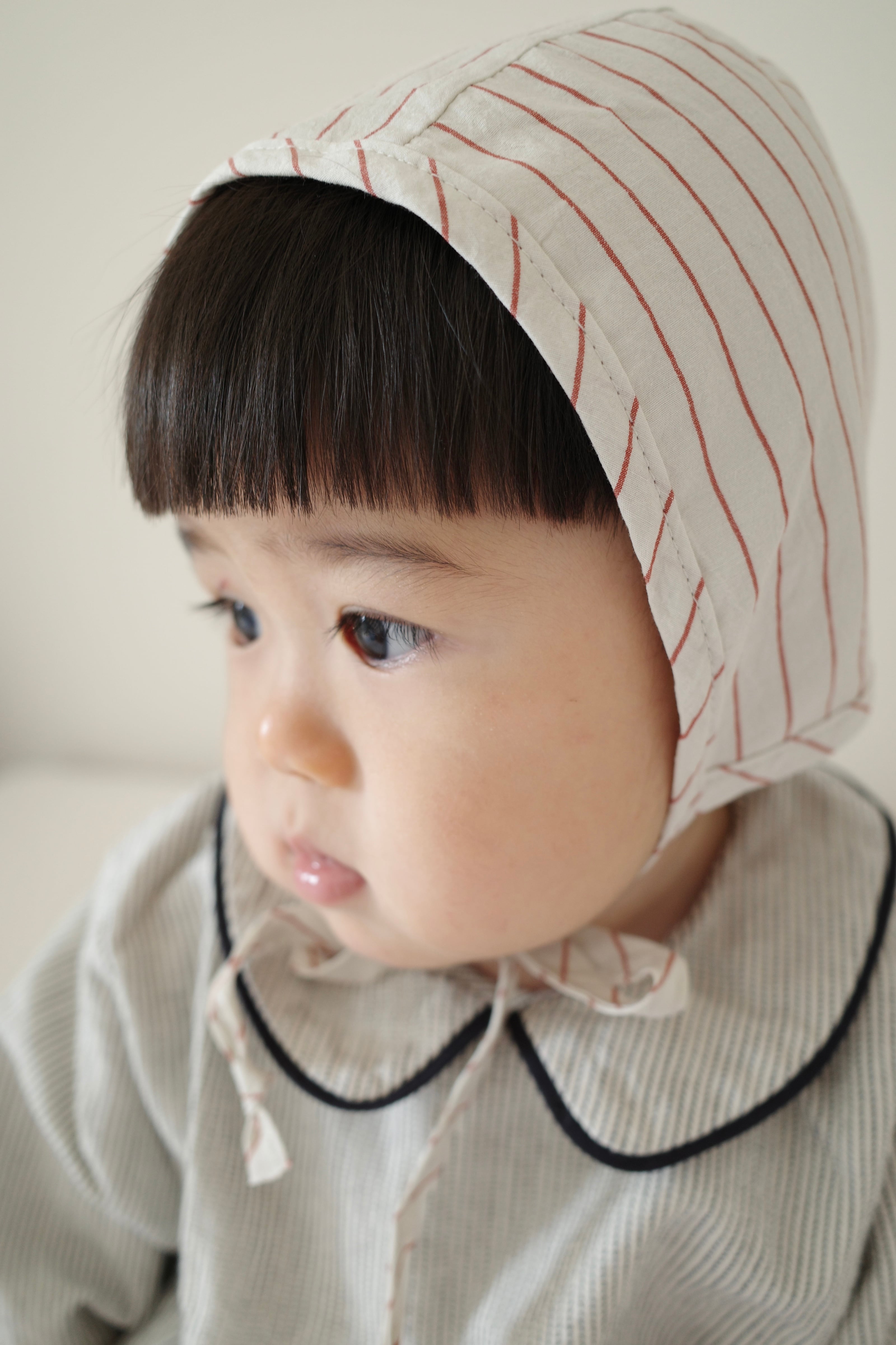 写真12〜16枚目…生後10ヶ月、頭囲44cm、Mサイズ(レッドストライプ)