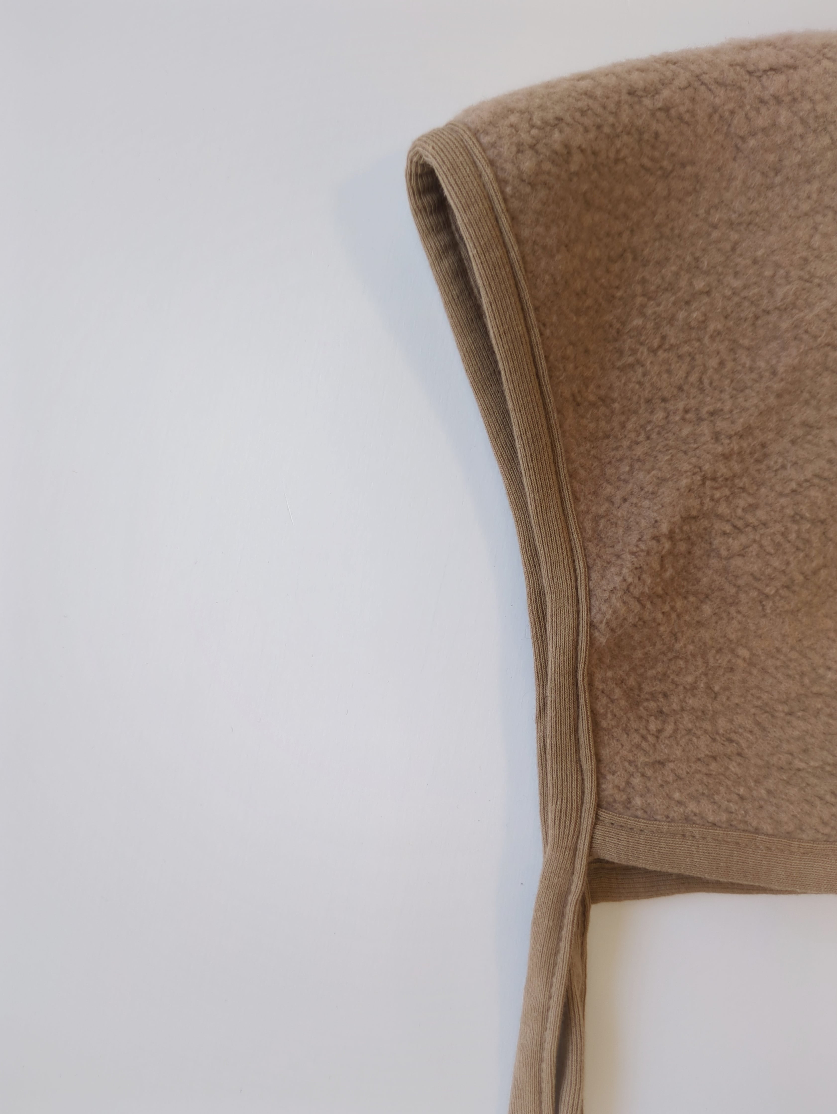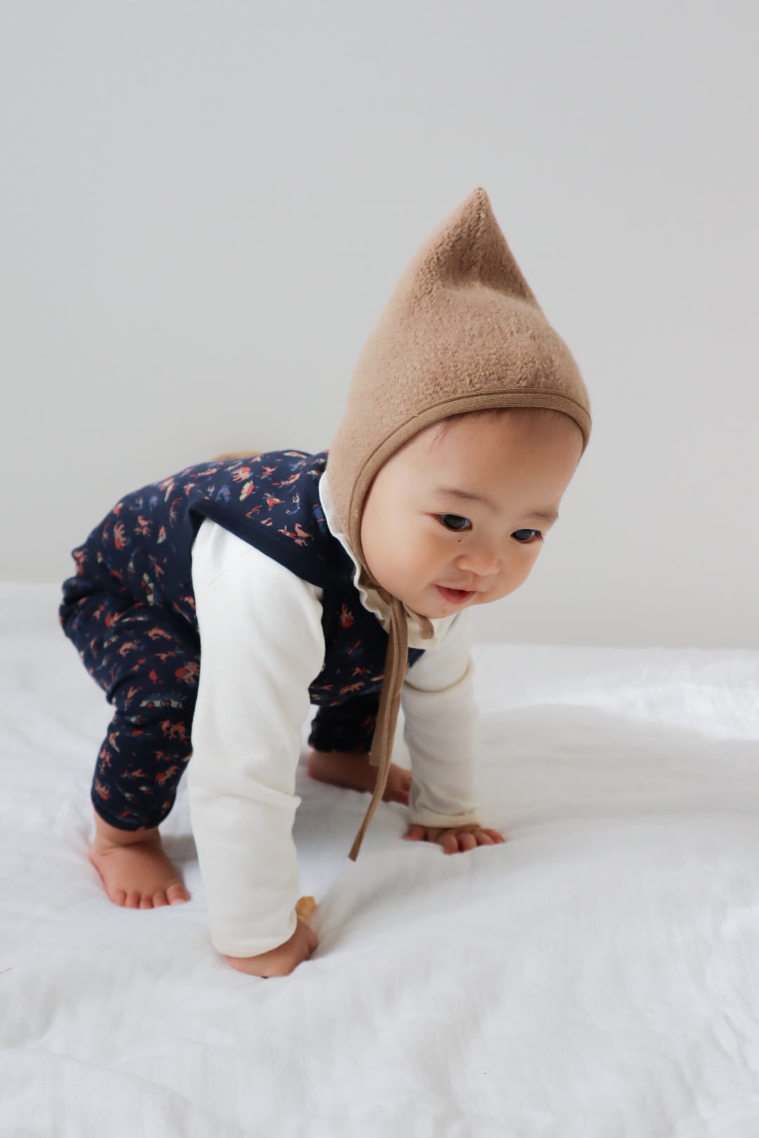 もこもこと起毛した生地を使用したピクシーボンネットです。