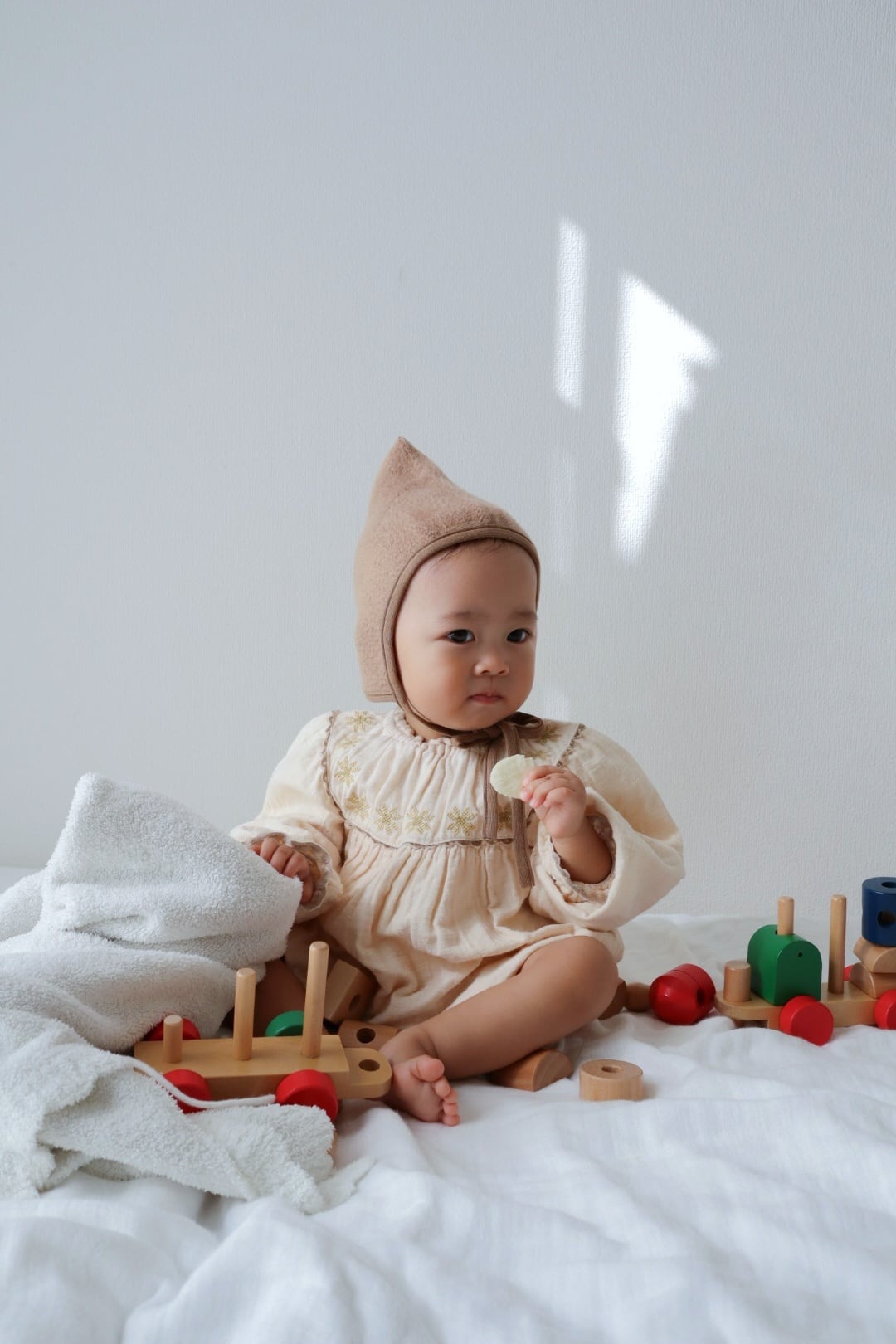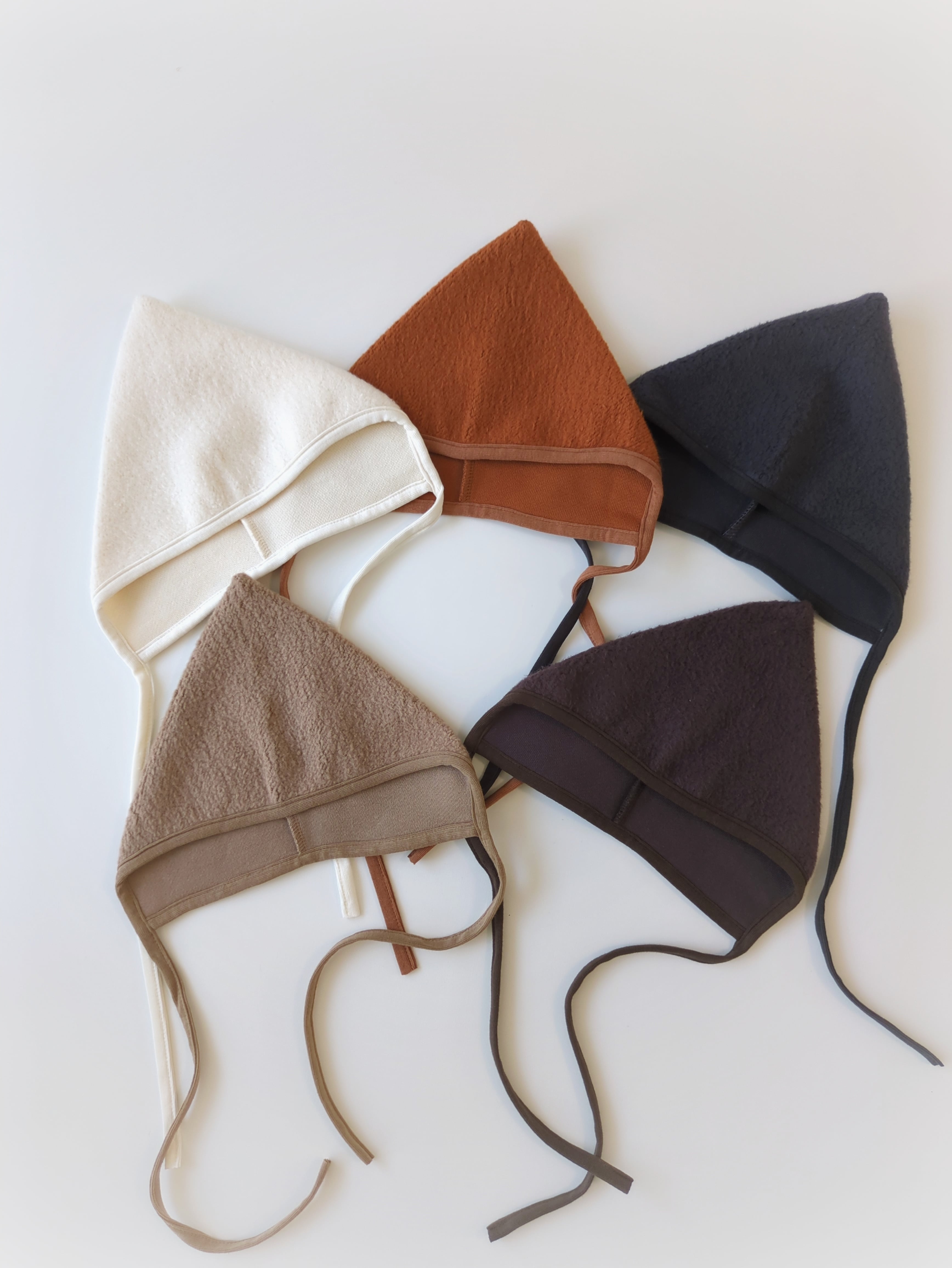 もこもこと起毛した生地を使用したピクシーボンネットです。