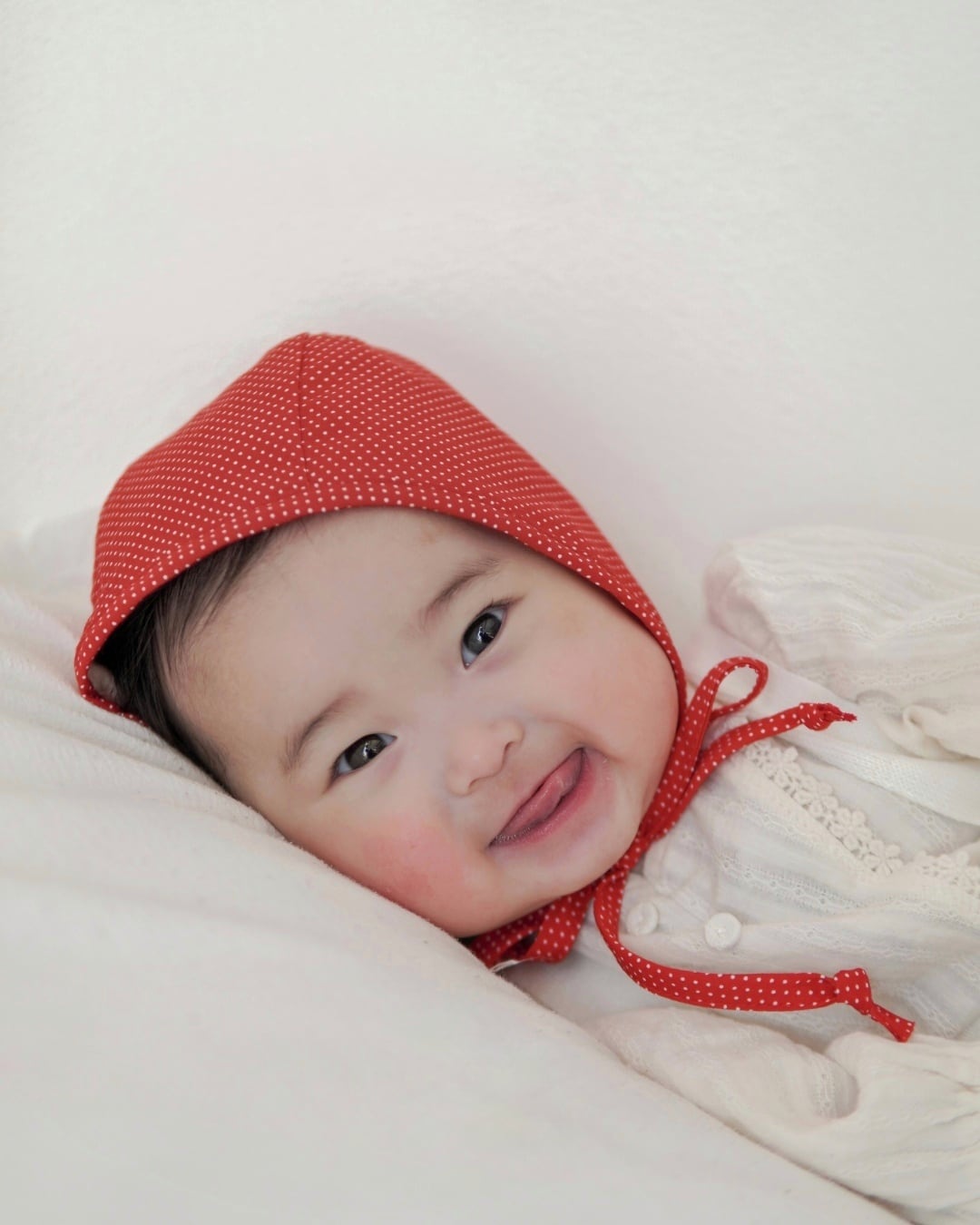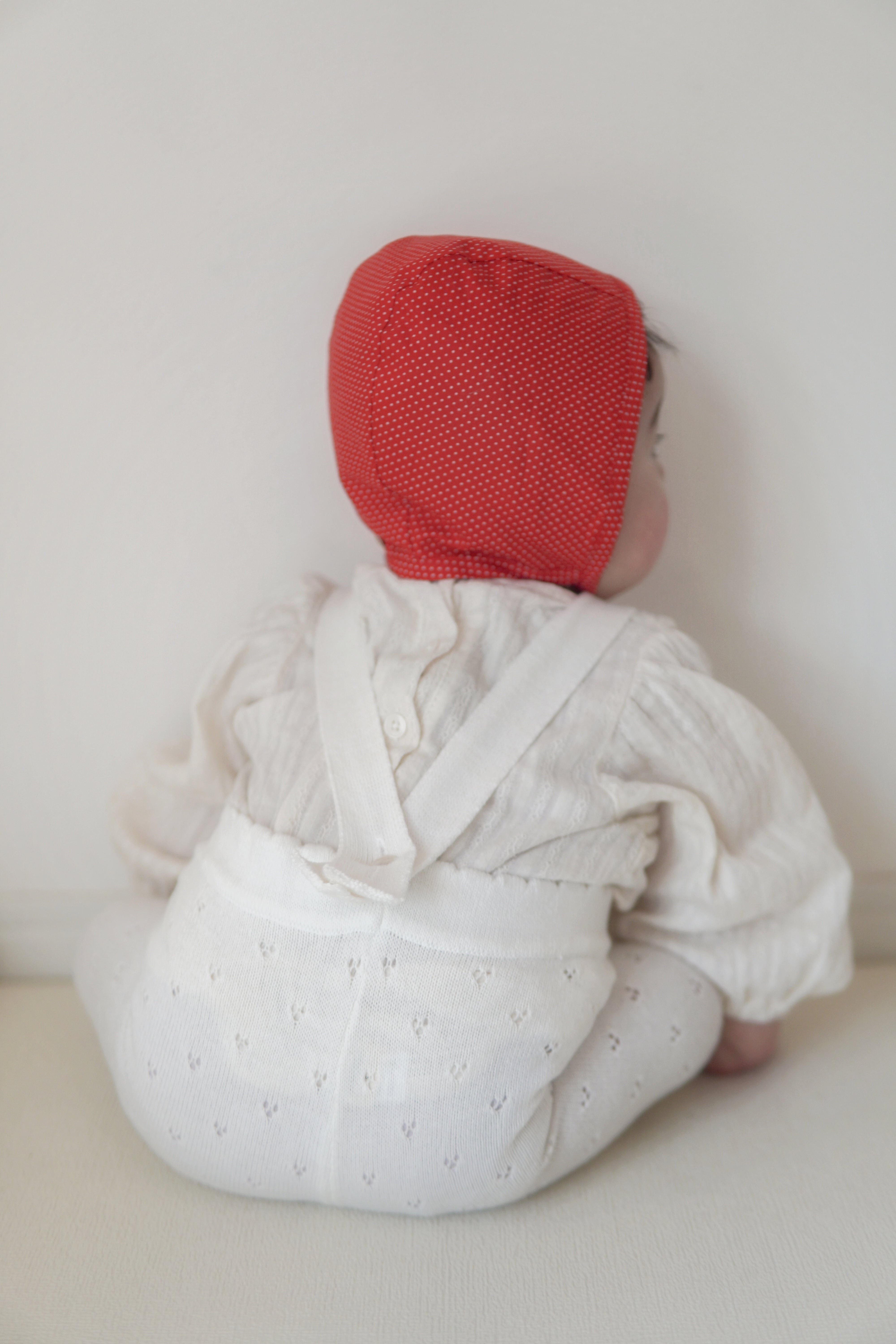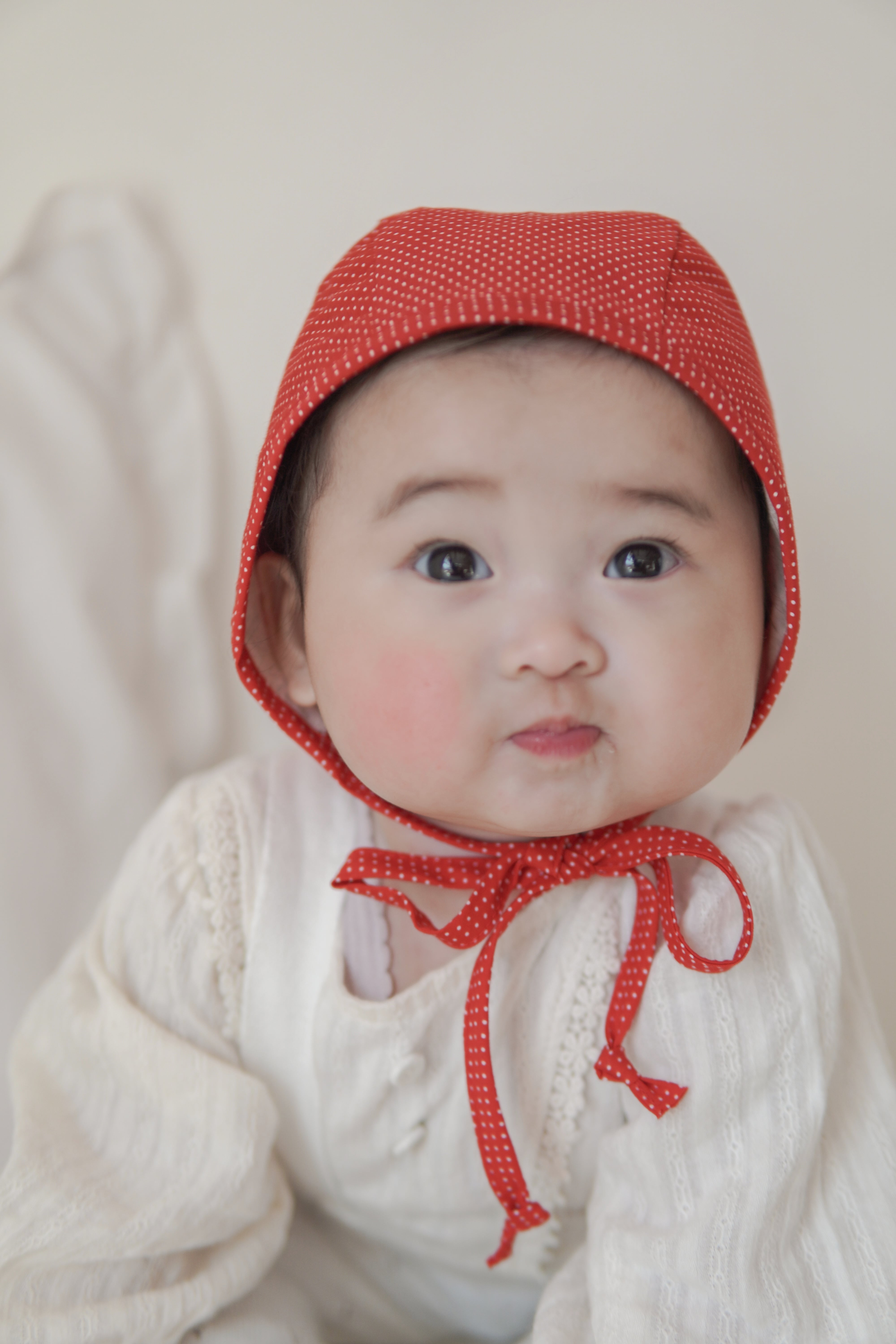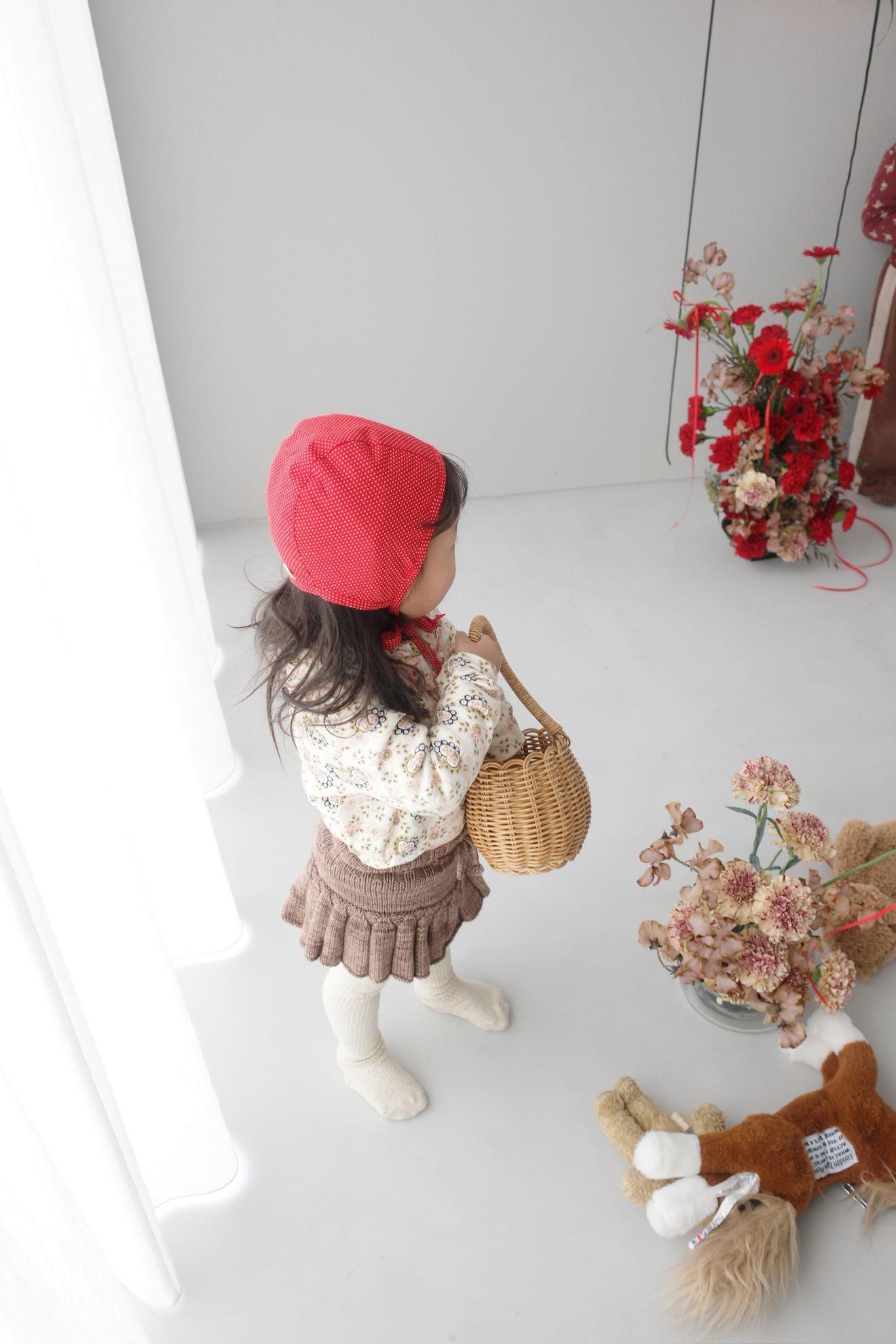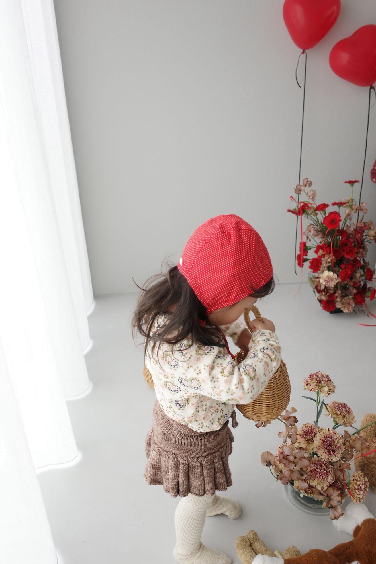 冬のニットにも春のブラウスにも合わせると可愛い赤いドットのボンネット。
