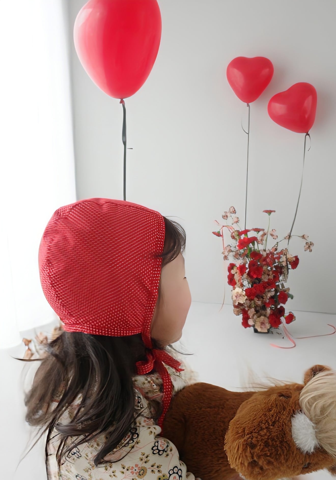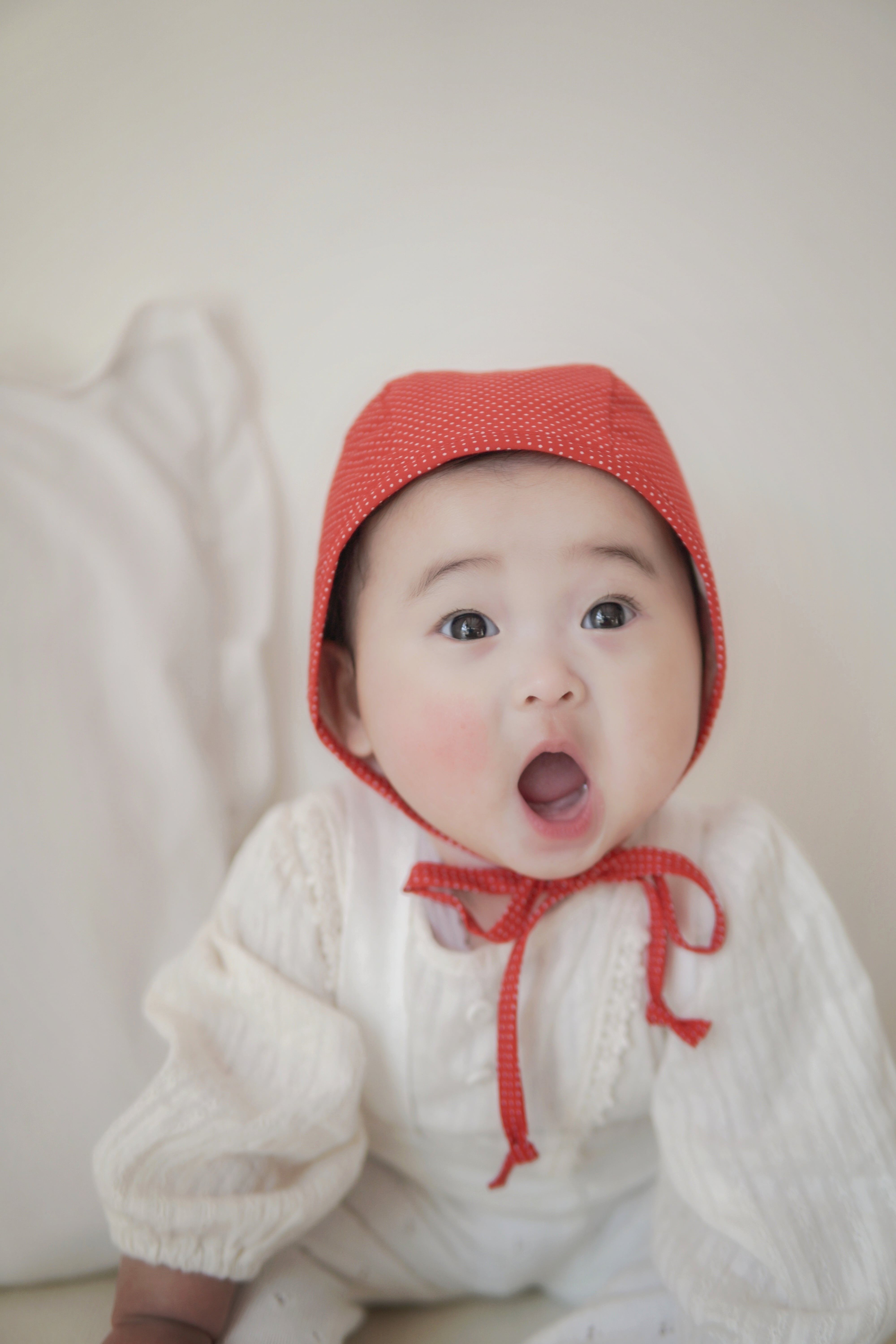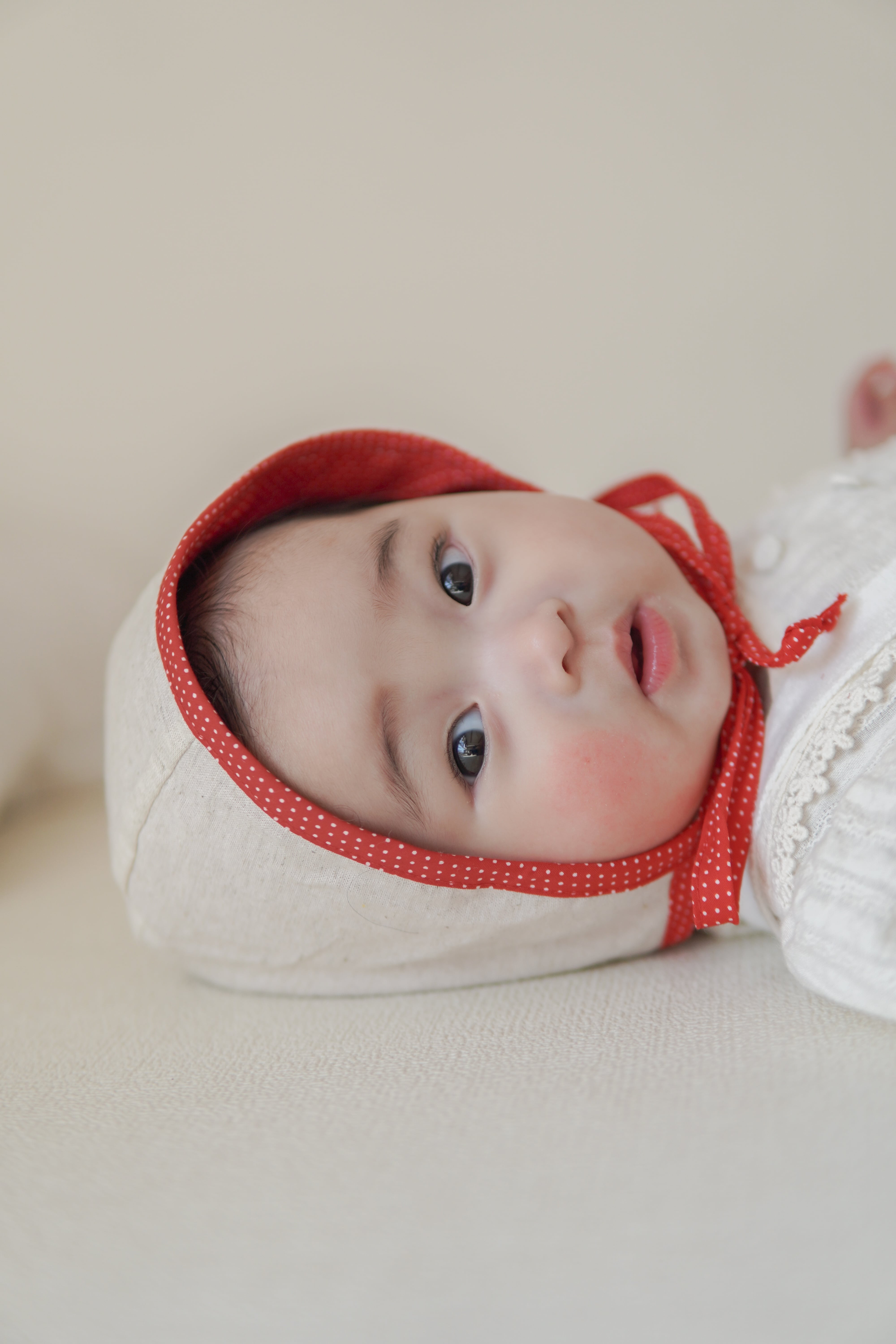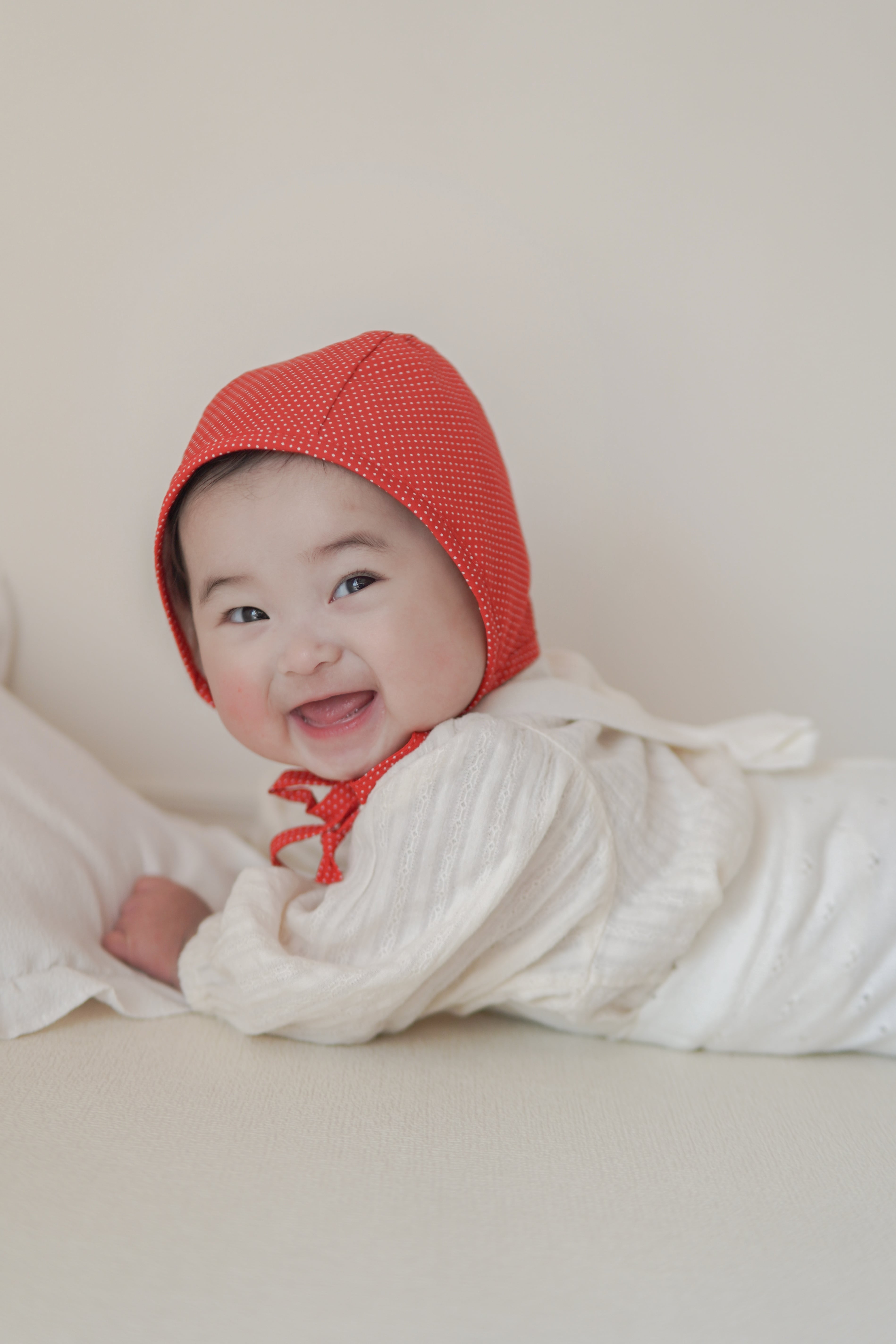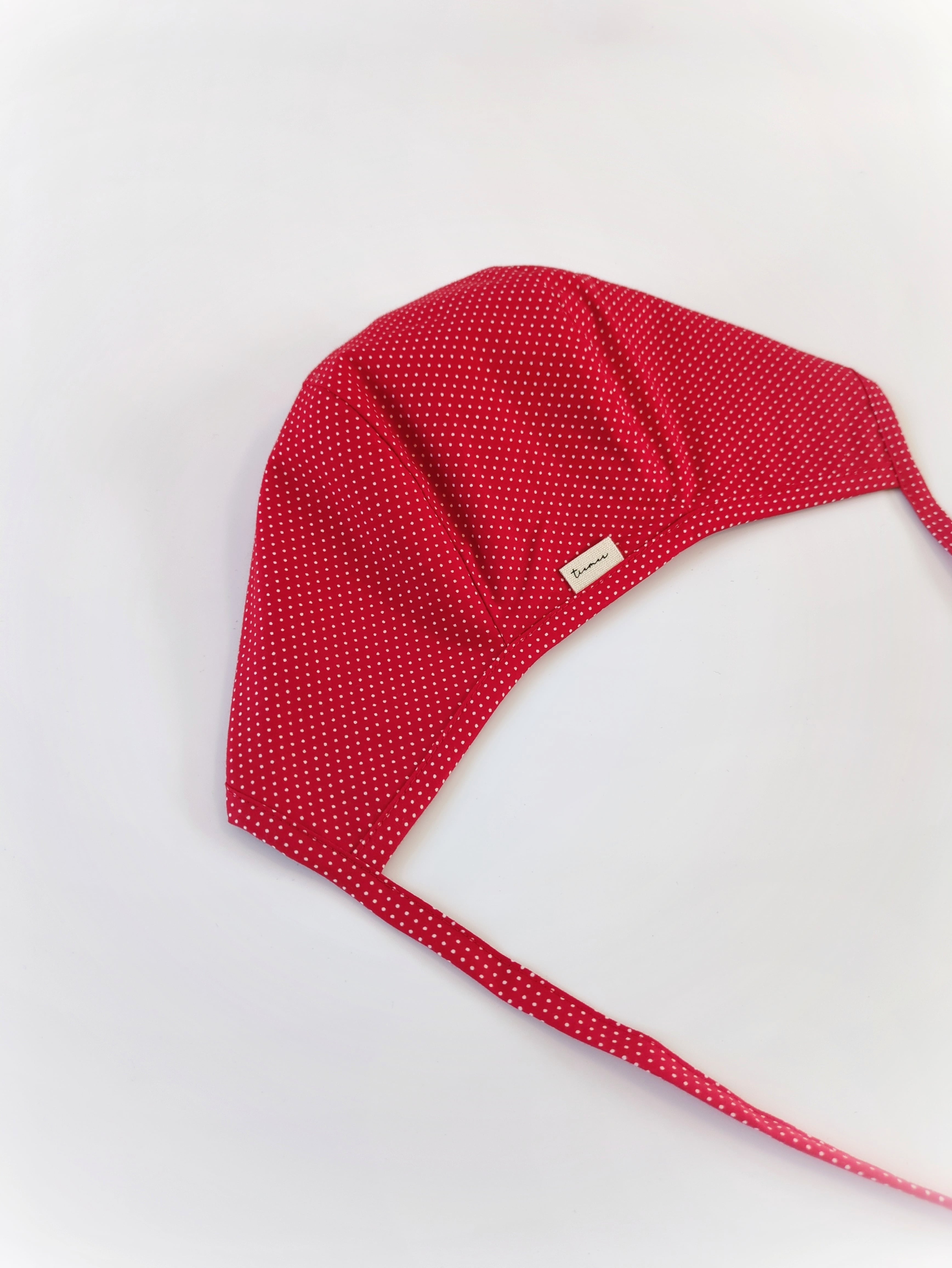 冬のニットにも春のブラウスにも合わせると可愛い赤いドットのボンネット。